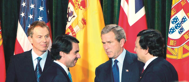 Durão Barroso, Tony Blair, George W. Bush e José Maria Aznar, na Cimeira da Guerra, Base das Lajes, Açores, 16 de Março de 2003.